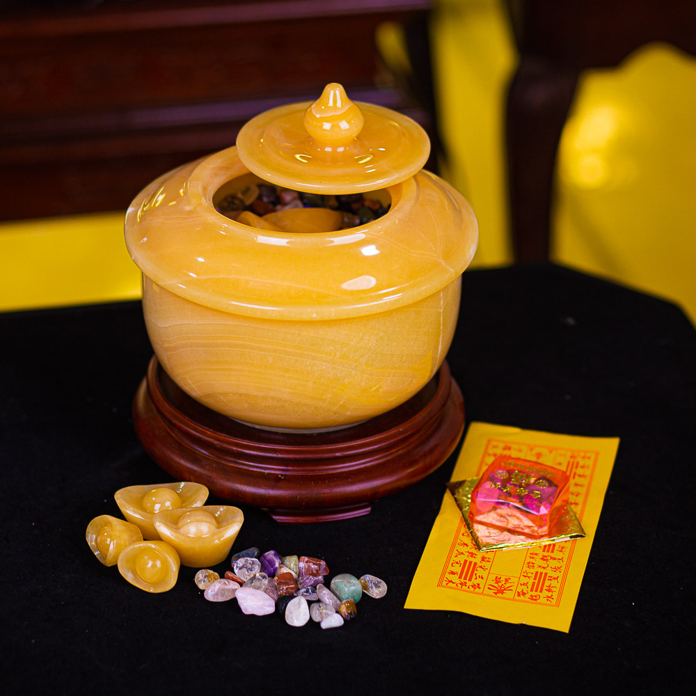 Gồm: Bát Tụ Bảo Ngọc Hoàng Long + 5 Nén Vàng Ngọc Hoàng Long + Vụn Ruby + Vụn Thạch Anh Ngũ Sắc + Cốt Thất Bảo + Đế gỗ