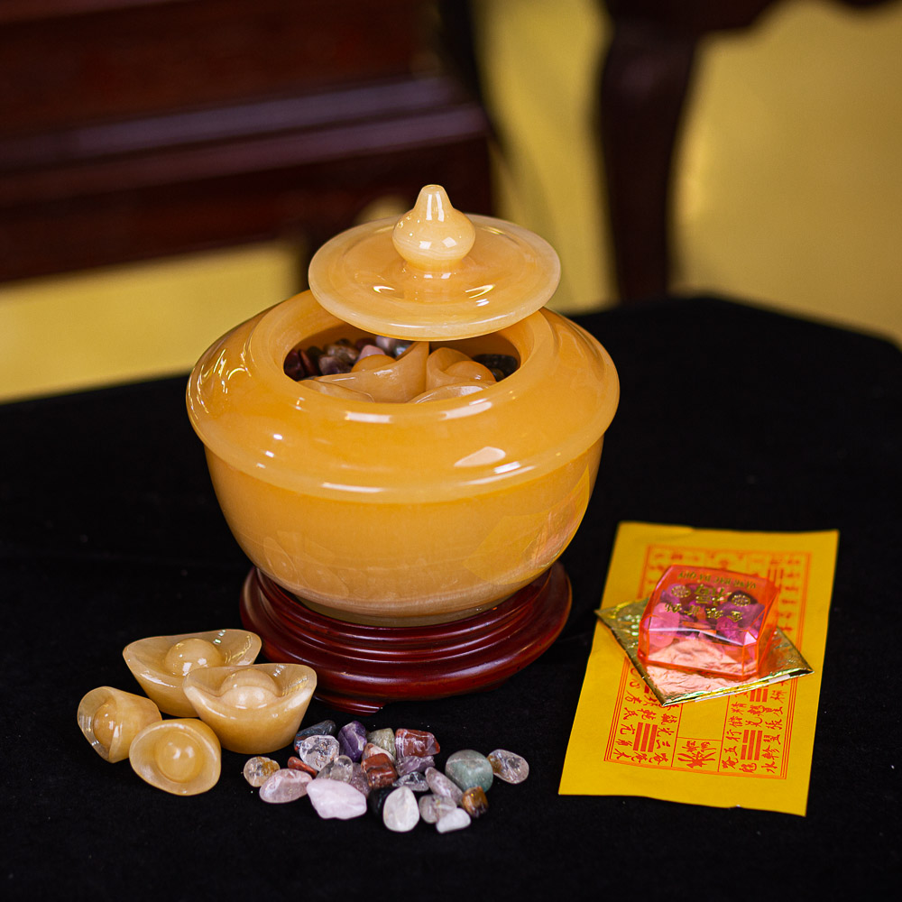 Gồm: Bát Tụ Bảo Ngọc Hoàng Long + 5 Nén Vàng Ngọc Hoàng Long + Vụn RuBy + Vụn Thạch Anh Ngũ Sắc + Cốt Thất Bảo + Đế gỗ