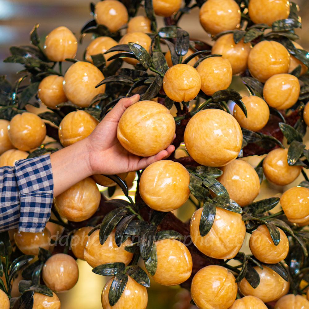 Cây đào đá ngọc hoàng long là vật phẩm được lấy cảm hứng từ cây đào tiên trong vườn đào Thượng Uyển của truyện Tây Du Ký. Quả đào được làm từ chất liệu đá ngọc hoàng long 100% tự nhiên thiên nhiên. Lá được làm từ chất liệu ngọc Serpentine màu xanh. Thân và các cành cây có lồng thép để dễ uốn nắn theo các hình dáng mà mọi người yêu cầu. Màu vàng của quả đào tượng trưng cho tài lộc tiền tài. Kết hợp cùng màu xanh của lá, màu tượng trưng của sự mới mẻ, sức sống.