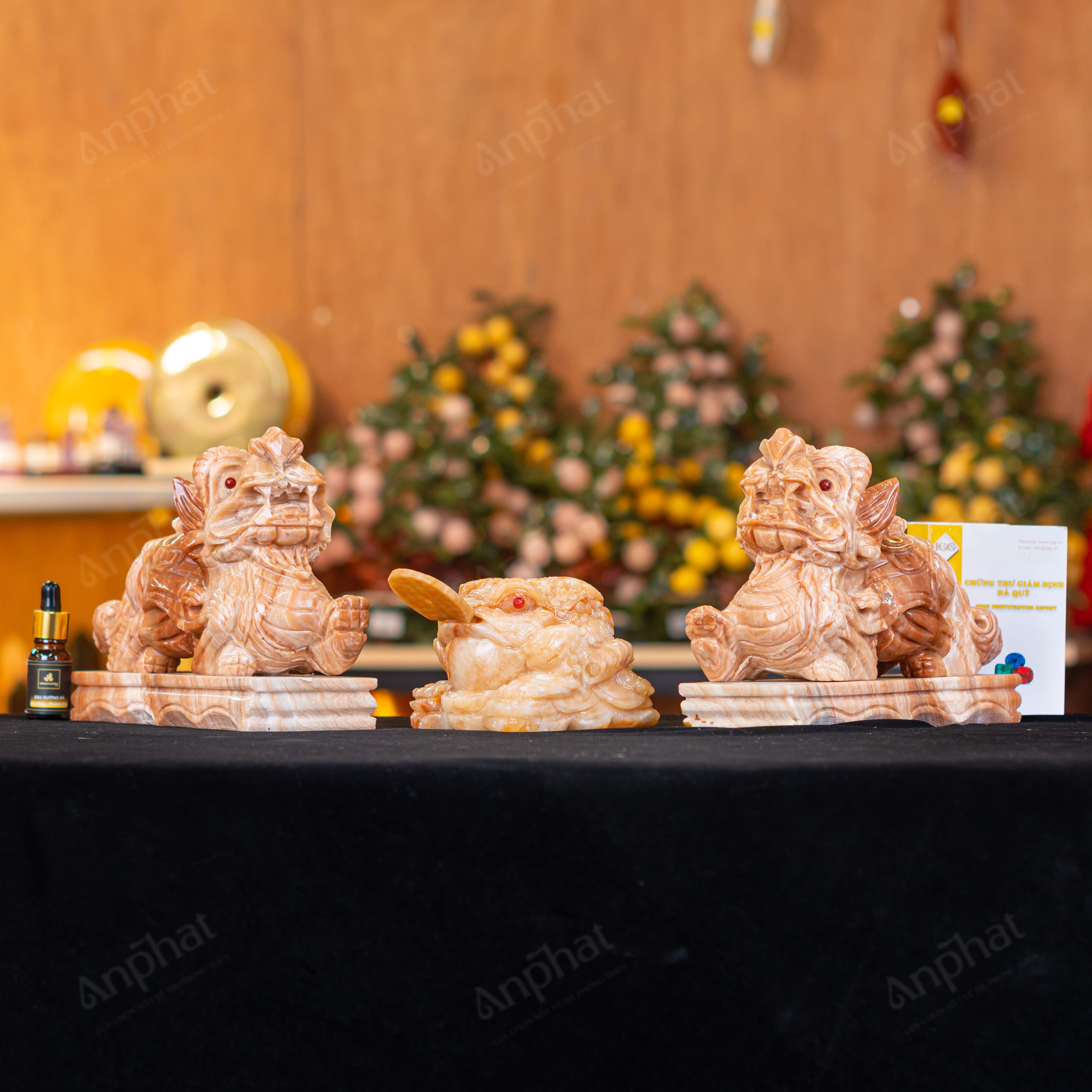 - Trọn bộ sản phẩm bao gồm: Combo linh vật + dầu dưỡng đá + thiệp + giấy kiểm định chất lượng đá + khăn thơm bao sái + giấy hướng dẫn trực tiếp an vị + khai quang tại chùa