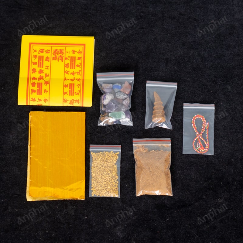 Trọn bộ sản phẩm bao gồm: Ngọc trai + Hổ phách + San hô đỏ + Ngọc bích (phỉ thúy) + Đá mã não đỏ + Bột ngũ vị + Vàng lá + Bạc Lá + 1 tờ trang kim + Nụ trầm + Thạch anh ngũ sắc bóng + 20 gram gạo vàng thần tài + Chỉ ngũ sắc + Dị hiệu + Hướng dẫn sử dụng
