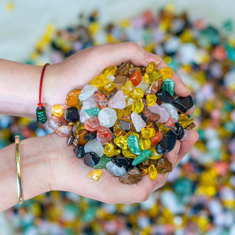 Đá Thạch Anh Vụn Ngũ Sắc Bóng (Loại 2) mang năng lượng và chất lượng thấp nhất trong 3 loại, có sử dụng đá vàng nhuộm, dễ mất màu trong môi trường nước. Đá Thạch Anh Vụn Ngũ Sắc Bóng (Loại 2) sử dụng các loại đá thạch anh cơ bản: trắng, đen, hồng, vàng nhuộm, mắt hổ, mã não đỏ...