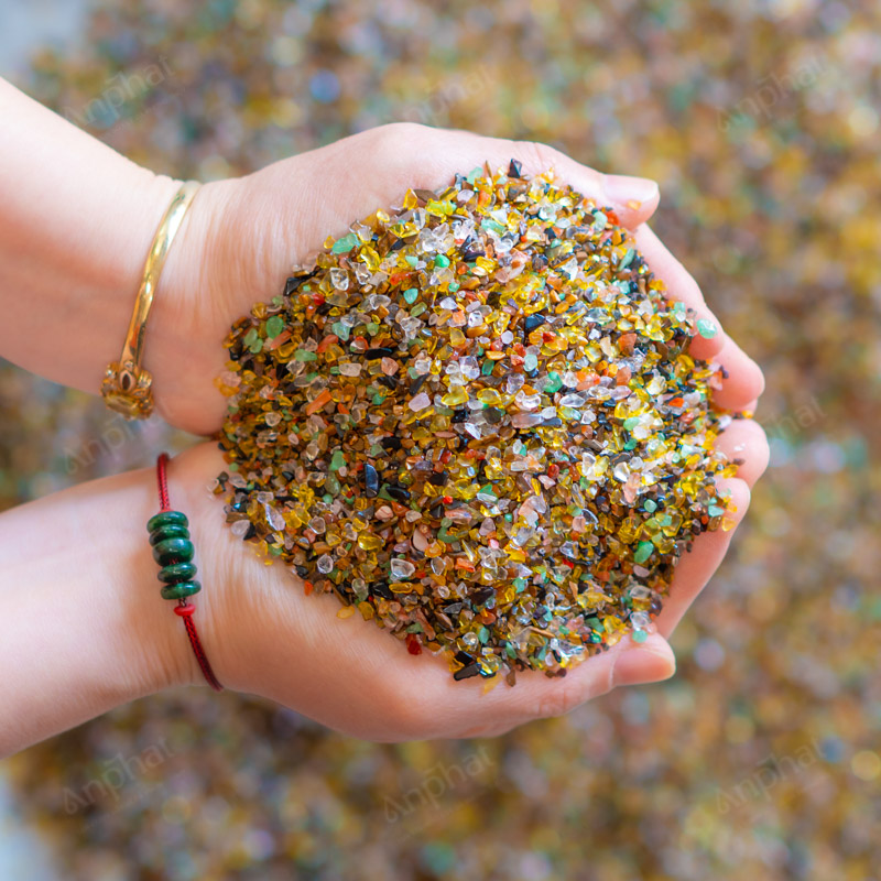 Đá Thạch Anh Vụn Ngũ Sắc Mini (Loại 2) là loại mang năng lượng thấp nhất trong 3 loại, có sử dụng đá vàng nhuộm khá dễ mất màu. Đá Thạch Anh Vụn Ngũ Sắc Mini (Loại 2) sử dụng các loại đá thạch anh cơ bản: vàng nhuộm, trắng, đen, hồng, đỏ, mắt hổ...