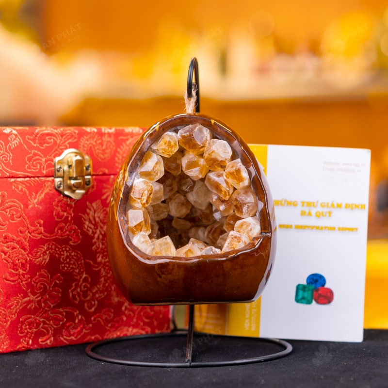 - Trọn bộ sản phẩm bao gồm: Đèn ngủ thạch anh + giá treo + hộp đựng sang trọng + túi giấy sang trọng + dầu dưỡng đá + thiệp + giấy kiểm định chất lượng đá