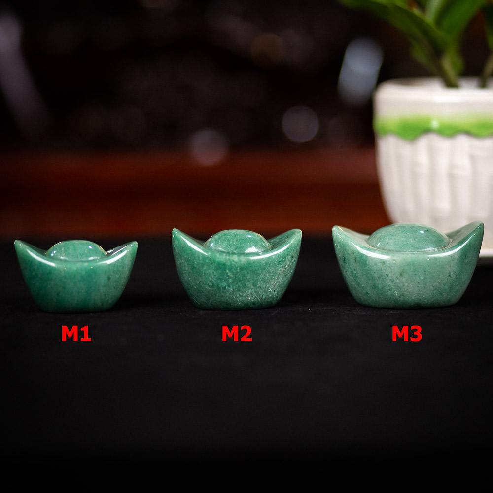 Mẫu vật phẩm kim nguyên bảo tại Đá Phong Thủy An Phát được làm từ chất liệu đá thạch anh xanh tự nhiên 100%. Nén vàng có màu xanh ngọc vô cùng đẹp mặt. Màu xanh của nén vàng rất đẹp và tinh tế, chính vì vậy vật phẩm có thể là vật trang trí mang tính thẩm mỹ cao. Sản phẩm này hiện ở Đá phong Thủy gồm 3 kích thước khác nhau, tùy vào mục đích sử dụng mà khách hàng có thể lựa chọn và yêu cầu An Phát chúng tôi chế tác.