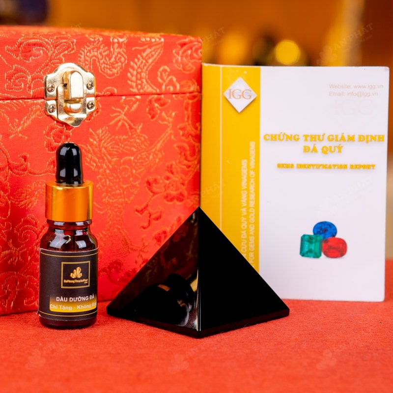 - Trọn bộ sản phẩm bao gồm: Kim tự tháp + hộp nhung sang trọng + túi giấy trang trọng + dầu dưỡng đá + thiệp + giấy kiểm định chất lượng đá