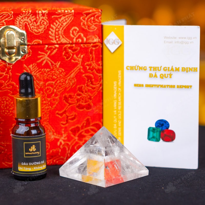 - Trọn bộ sản phẩm bao gồm: Kim tự tháp + hộp nhung sang trọng + túi giấy trang trọng + dầu dưỡng đá + thiệp + giấy kiểm định chất lượng đá