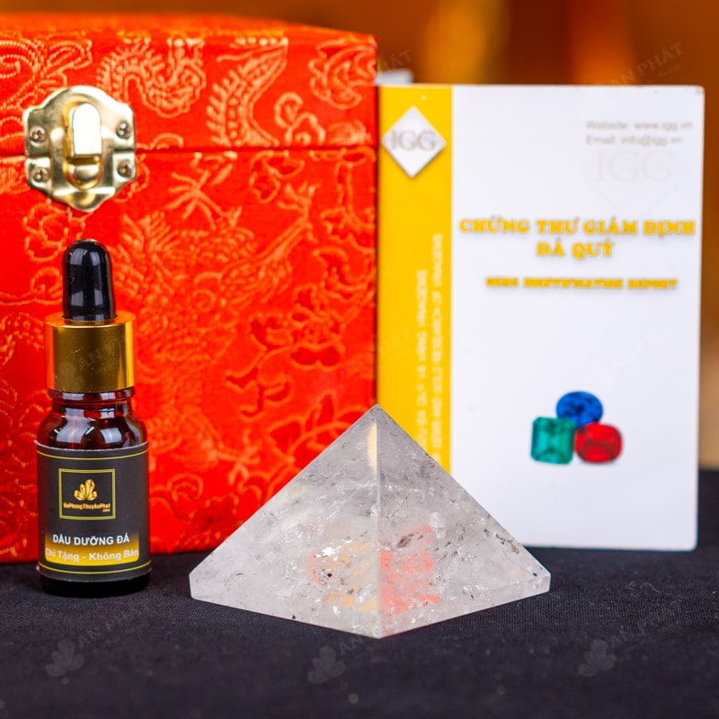 - Trọn bộ sản phẩm bao gồm: Kim tự tháp + hộp nhung sang trọng + túi giấy trang trọng + dầu dưỡng đá + thiệp + giấy kiểm định chất lượng đá