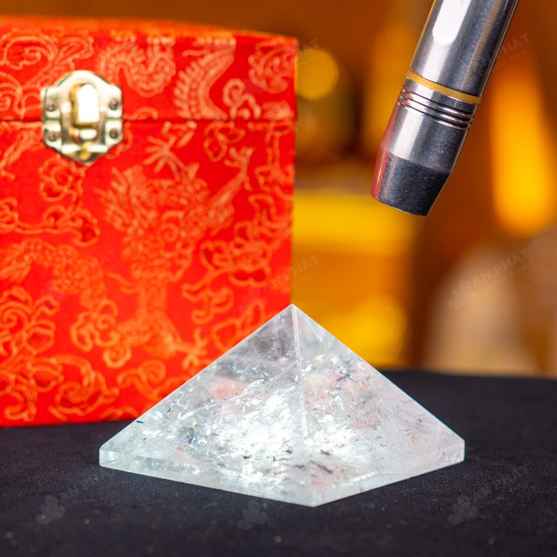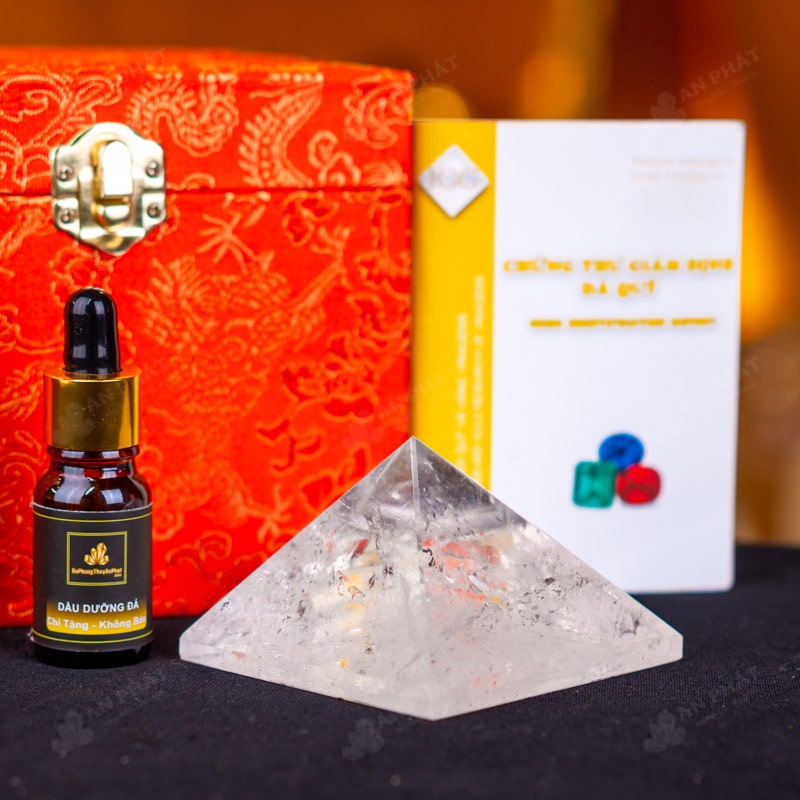 - Trọn bộ sản phẩm bao gồm: Kim tự tháp + hộp nhung sang trọng + túi giấy trang trọng + dầu dưỡng đá + thiệp + giấy kiểm định chất lượng đá