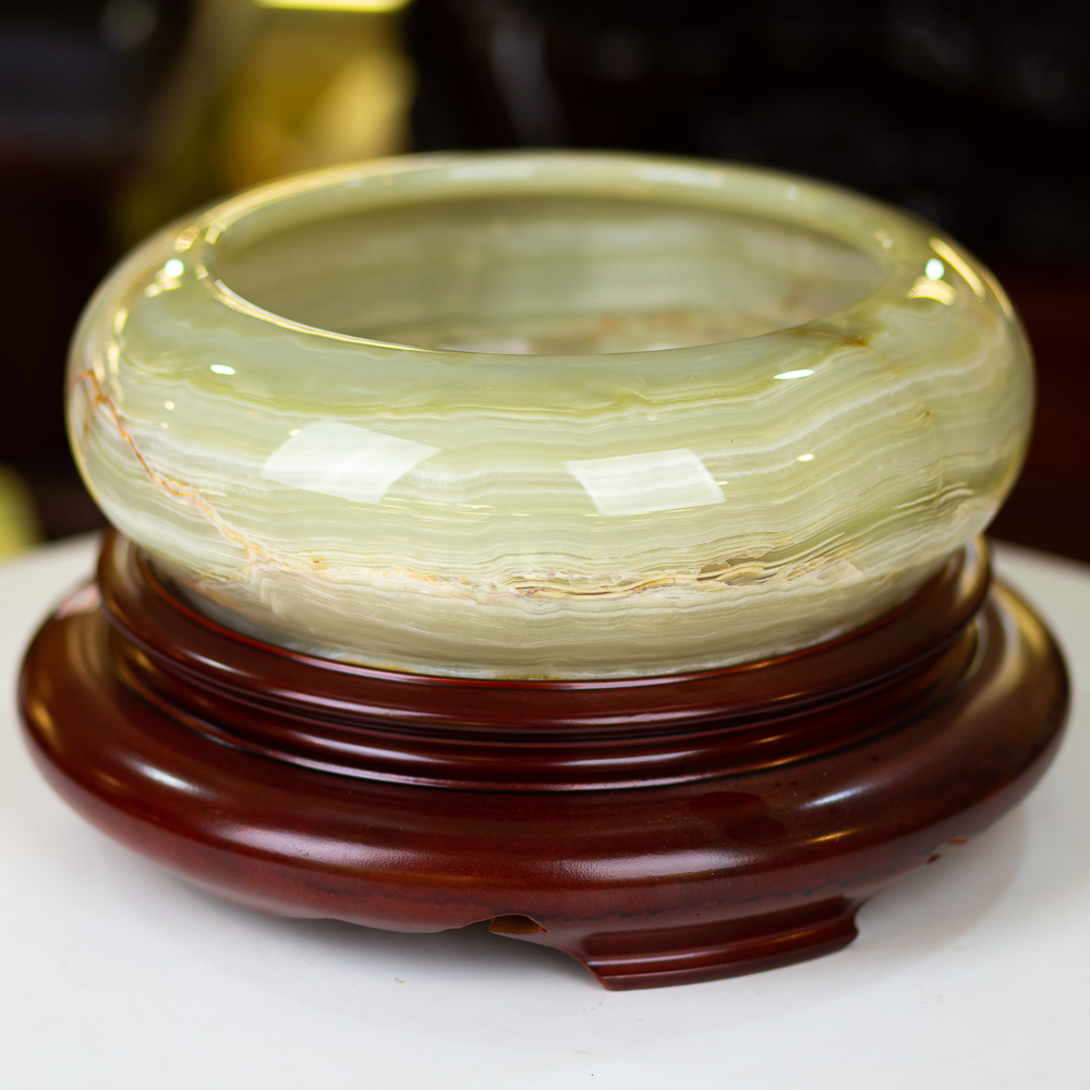 Với mẫu sản phẩm Minh Đường Tụ Thủy tại An Phát được làm từ chất liệu đá ngọc Onyx xanh tự nhiên 100% vô cùng đẹp mắt. Sản phẩm được thiết kế với hình dạng bát, ghi dấu bởi các đường vân dải tự nhiên bao quanh bát. Tạo cảm giác như các dãy núi kéo dài hay dòng nước chảy xiết.