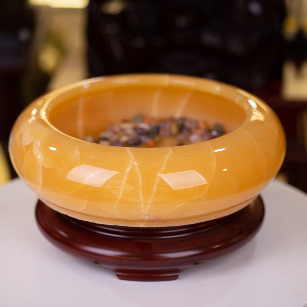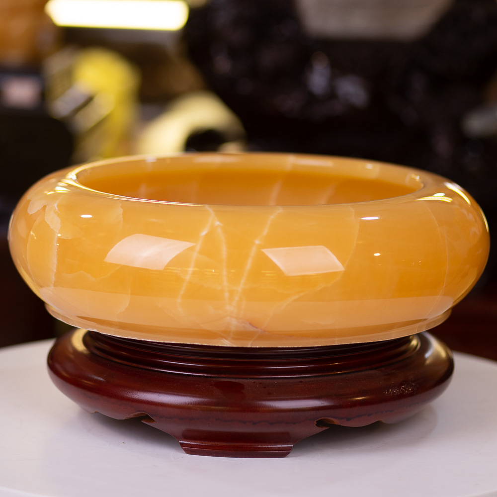 Với mẫu sản phẩm Minh Đường Tụ Thủy tại An Phát được làm từ chất liệu đá ngọc Onyx vàng tự nhiên 100% vô cùng đẹp mắt. Sản phẩm được thiết kế với hình dạng bát, ghi dấu bởi các đường vân dải tự nhiên bao quanh bát. Tạo cảm giác như các dãy núi kéo dài hay dòng nước chảy xiết.