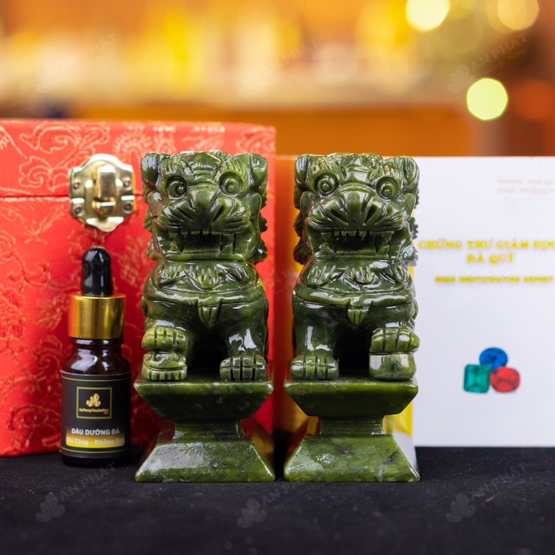 - Trọn bộ sản phẩm bao gồm: Nghê đá + hộp đựng sang trọng + túi giấy sang trọng + dầu dưỡng đá + thiệp + giấy kiểm định chất lượng đá