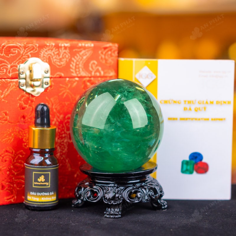 - Trọn bộ sản phẩm bao gồm: quả cầu + 01 đế gỗ + hộp đựng sang trọng + túi đựng sang trọng + dầu dưỡng đá + thiệp + giấy kiểm định chất lượng đá