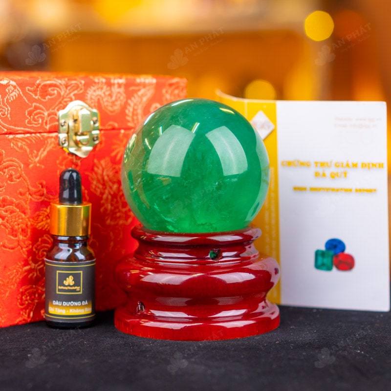 - Trọn bộ sản phẩm bao gồm: quả cầu + 01 đế gỗ + hộp đựng sang trọng + túi đựng sang trọng + dầu dưỡng đá + thiệp + giấy kiểm định chất lượng đá