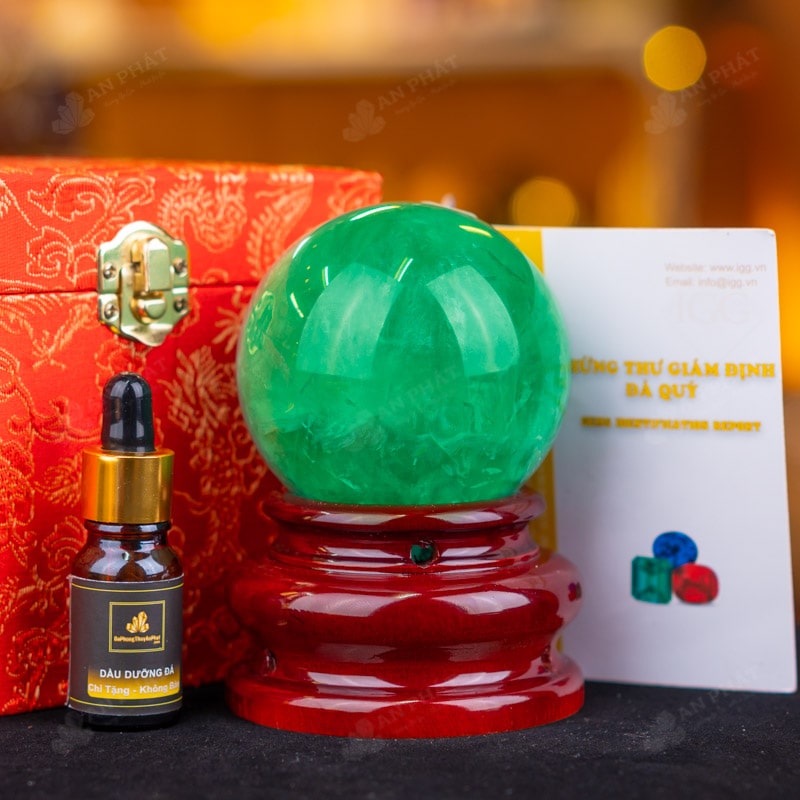 - Trọn bộ sản phẩm bao gồm: quả cầu + 01 đế gỗ + hộp đựng sang trọng + túi đựng sang trọng + dầu dưỡng đá + thiệp + giấy kiểm định chất lượng đá