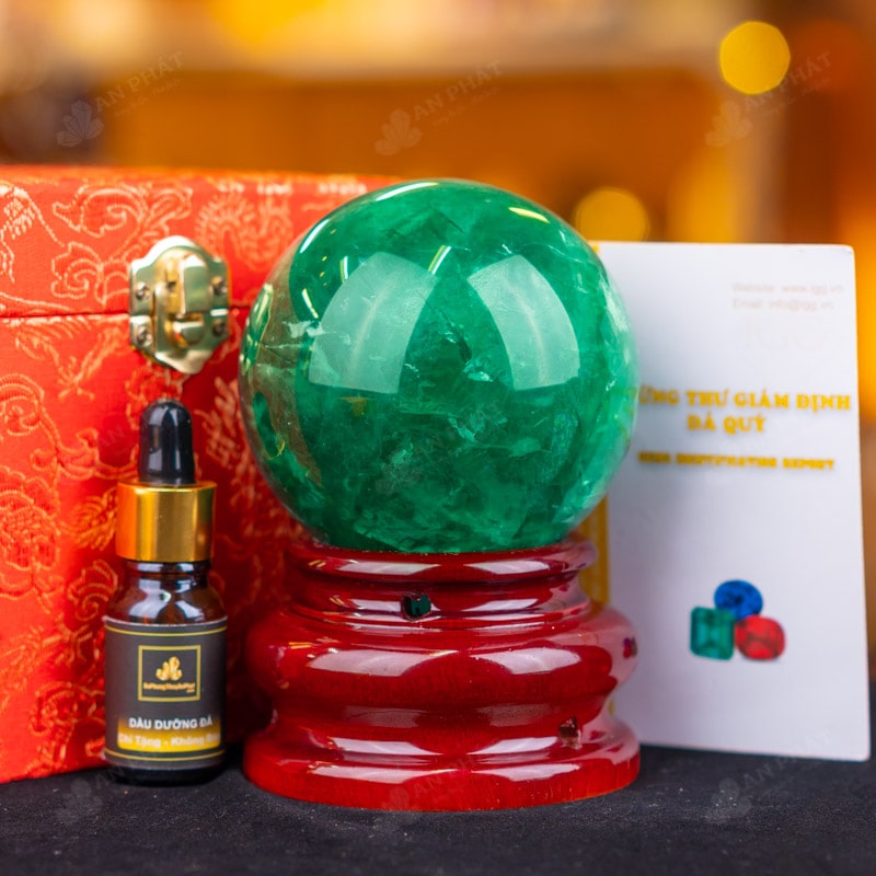 - Trọn bộ sản phẩm bao gồm: quả cầu + 01 đế gỗ + hộp đựng sang trọng + túi đựng sang trọng + dầu dưỡng đá + thiệp + giấy kiểm định chất lượng đá