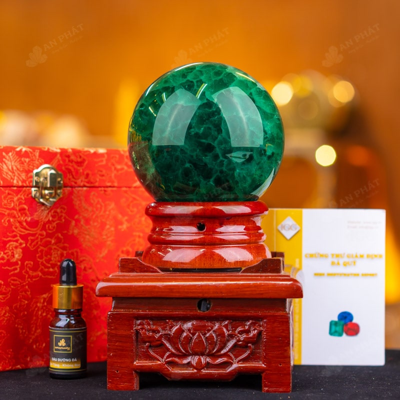 - Trọn bộ sản phẩm bao gồm: quả cầu + 01 đế gỗ + hộp đựng sang trọng + túi đựng sang trọng + dầu dưỡng đá + thiệp + giấy kiểm định chất lượng đá