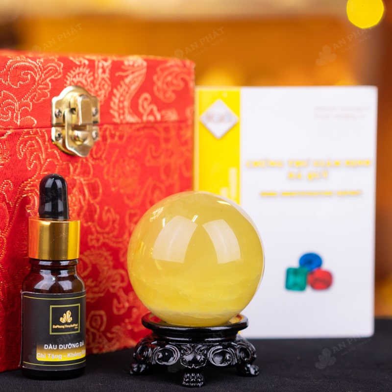 - Trọn bộ sản phẩm bao gồm: quả cầu + 01 đế gỗ + hộp đựng sang trọng + túi giấy sang trọng + dầu dưỡng đá + thiệp + giấy kiểm định chất lượng đá