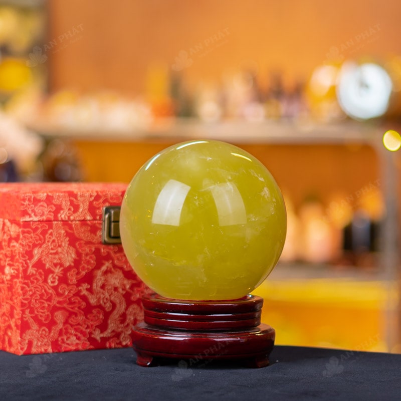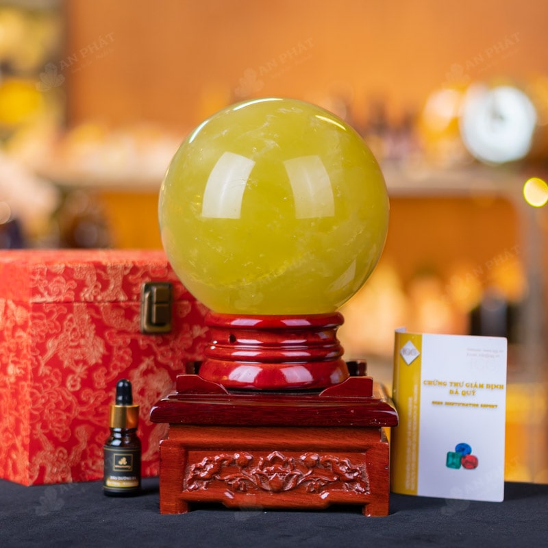 - Trọn bộ sản phẩm bao gồm: quả cầu + 01 đế gỗ + hộp đựng sang trọng + túi giấy sang trọng + dầu dưỡng đá + giấy kiểm định chất lượng đá