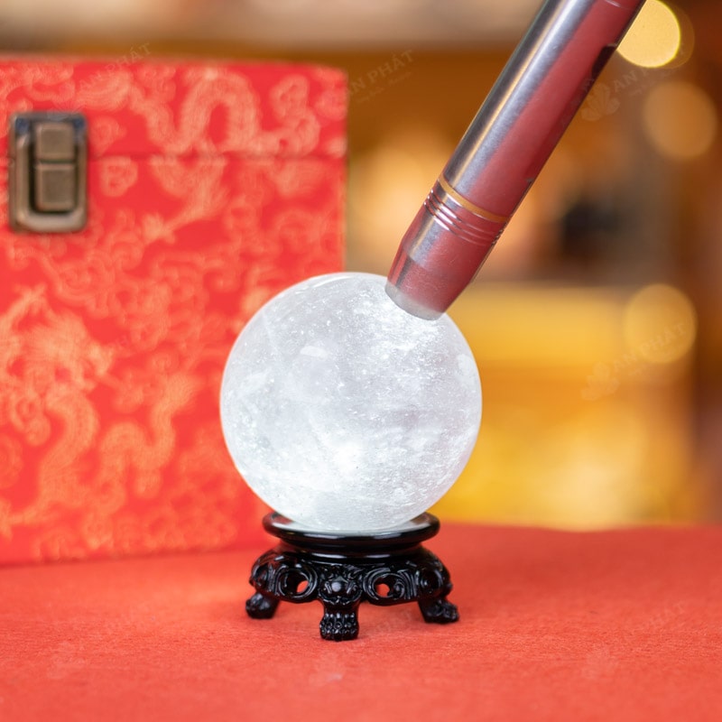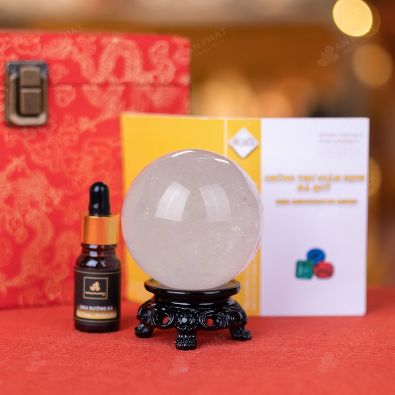 - Trọn bộ sản phẩm bao gồm: quả cầu + 01 đế gỗ + hộp đựng sang trọng + túi giấy sang trọng + dầu dưỡng đá + giấy kiểm định chất lượng đá