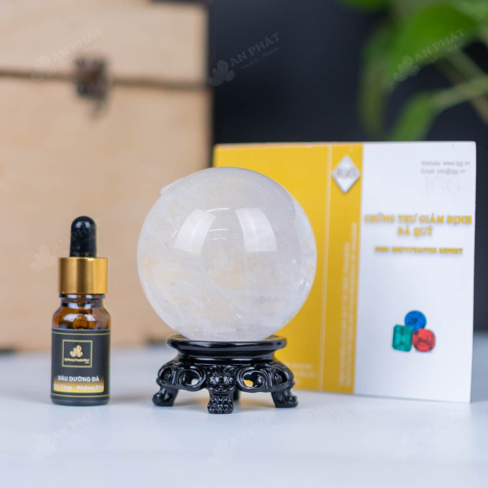 - Trọn bộ sản phẩm bao gồm: quả cầu + đế gỗ + hộp đựng sang trọng + túi giấy sang trọng + dầu dưỡng đá + giấy kiểm định chất lượng đá + trì chú