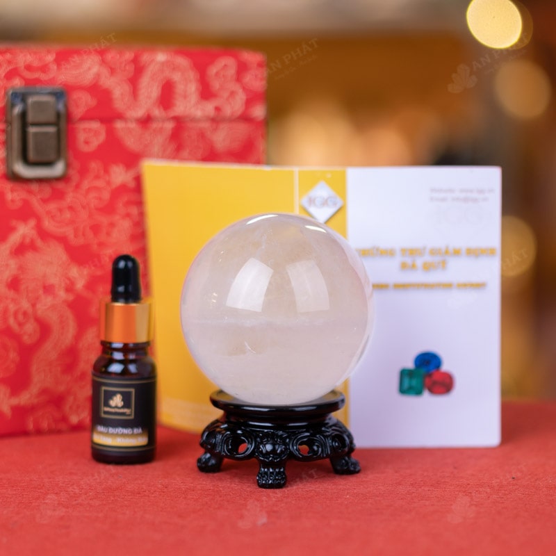 - Trọn bộ sản phẩm bao gồm: quả cầu + 01 đế gỗ + hộp đựng sang trọng + túi giấy sang trọng + dầu dưỡng đá + giấy kiểm định chất lượng đá