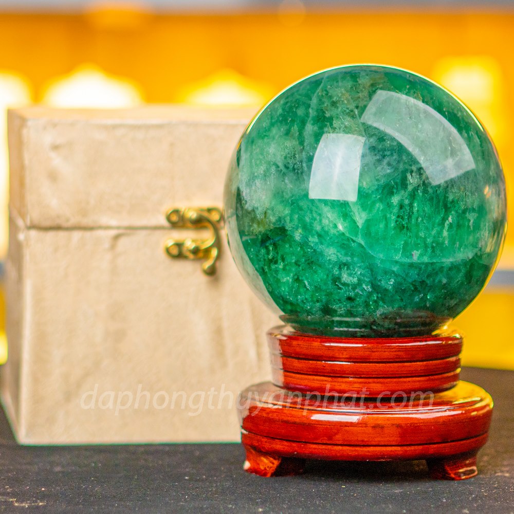 Quả cầu Fluorit Xanh lục là sản phẩm phong thủy được ưa chuộng. Với sản phẩm quả cầu đá Fluorit này được chế tác từ đá Fluorite xanh lục nguyên khối và chất lượng hoàn toàn. Màu xanh lục với độ thấu quang rất cao cùng các đường vân đá tự nhiên đẹp mắt. Kiểu thiết kế tròn hình cầu biểu tượng cho sự tròn trĩnh, toàn diễn. Trưng bày quả cầu này giúp thu các nguồn năng lượng tích cực, mang lại may mắn cho gia chủ. Sản phẩm phù hợp với nhiều đối tượng sử dụng, đặc biệt là những người làm kinh doanh.