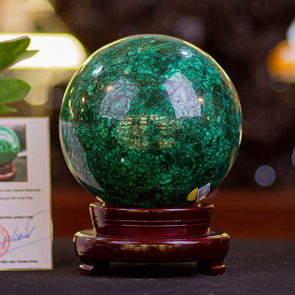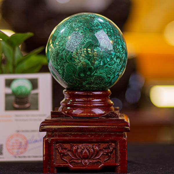 Quả cầu đá lông công tại Đá Phong thủy An Phát được chế tác 100% từ đá lông công Malachite tự nhiên. Qua đôi tay tài hoa của những nghệ nhân chế tác đá, quả cầu mang vẻ đẹp mê hoặc của sắc xanh quyến rũ, màu xanh mang lại may mắn và sức sáng tạo, sinh sôi tài lộc. Đây không chỉ là vật phẩm trang hoàng trong không gian sống thêm sinh động, còn giúp thu hút vào không gian những năng lượng tích cực, giúp con người mạnh khỏe, gặt hái nhiều may mắn trong công việc, cuộc sống để chạm tới thành công.