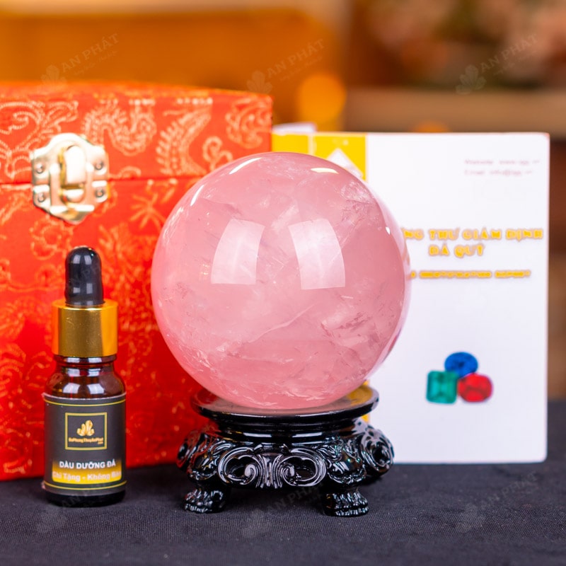 - Trọn bộ sản phẩm bao gồm: quả cầu + 01 đế gỗ + hộp đựng sang trọng + túi giấy sang trọng + dầu dưỡng đá + thiệp + giấy kiểm định chất lượng đá