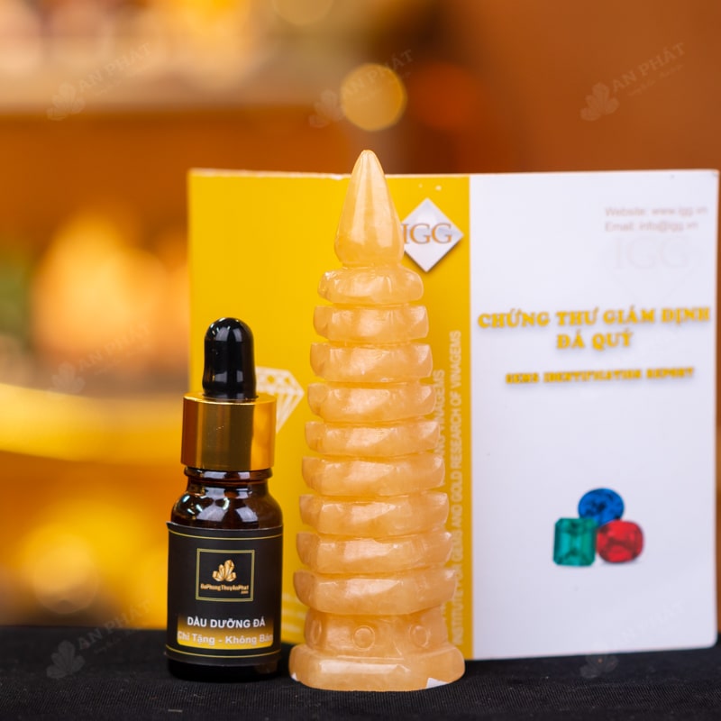 - Trọn bộ sản phẩm bao gồm: Tháp văn xương + hộp đựng sang trọng + túi giấy sang trọng + dầu dưỡng đá + thiệp + giấy kiểm định chất lượng đá