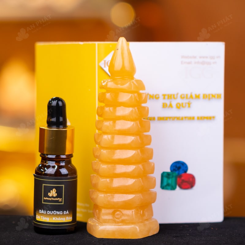 - Trọn bộ sản phẩm bao gồm: Tháp văn xương + hộp đựng sang trọng + túi giấy sang trọng + dầu dưỡng đá + thiệp + giấy kiểm định chất lượng đá