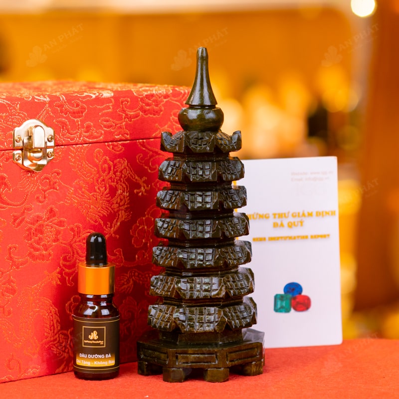 - Trọn bộ sản phẩm bao gồm: Tháp văn xương + hộp đựng sang trọng + túi giấy sang trọng + dầu dưỡng đá + thiệp + giấy kiểm định chất lượng đá
