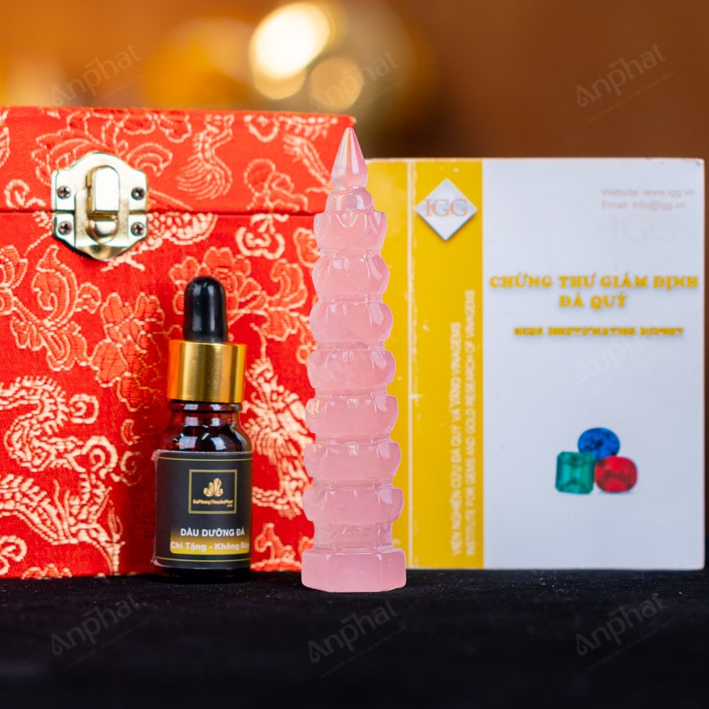 - Trọn bộ sản phẩm bao gồm: Tháp văn xương + hộp đựng sang trọng + túi giấy sang trọng + dầu dưỡng đá + thiệp + giấy kiểm định chất lượng đá
