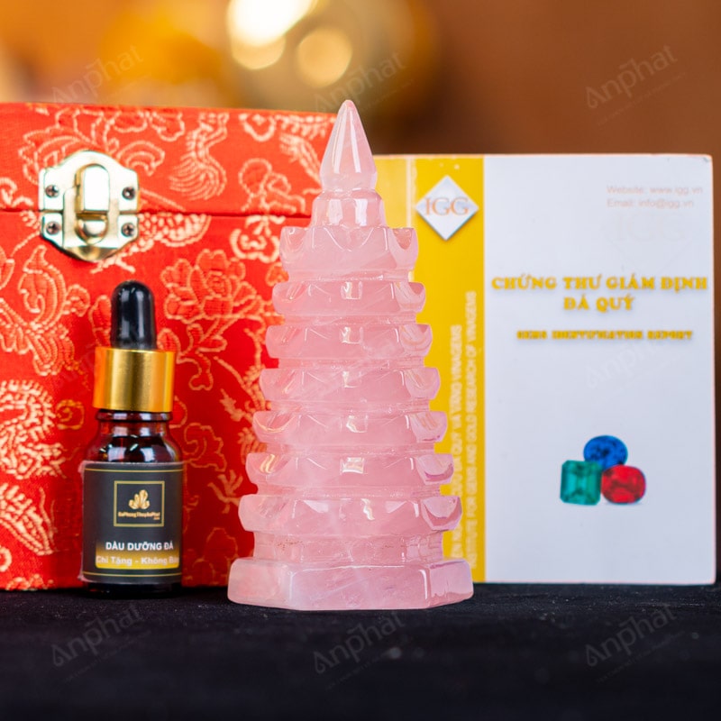 - Trọn bộ sản phẩm bao gồm: Tháp văn xương + hộp đựng sang trọng + túi giấy sang trọng + dầu dưỡng đá + thiệp + giấy kiểm định chất lượng đá