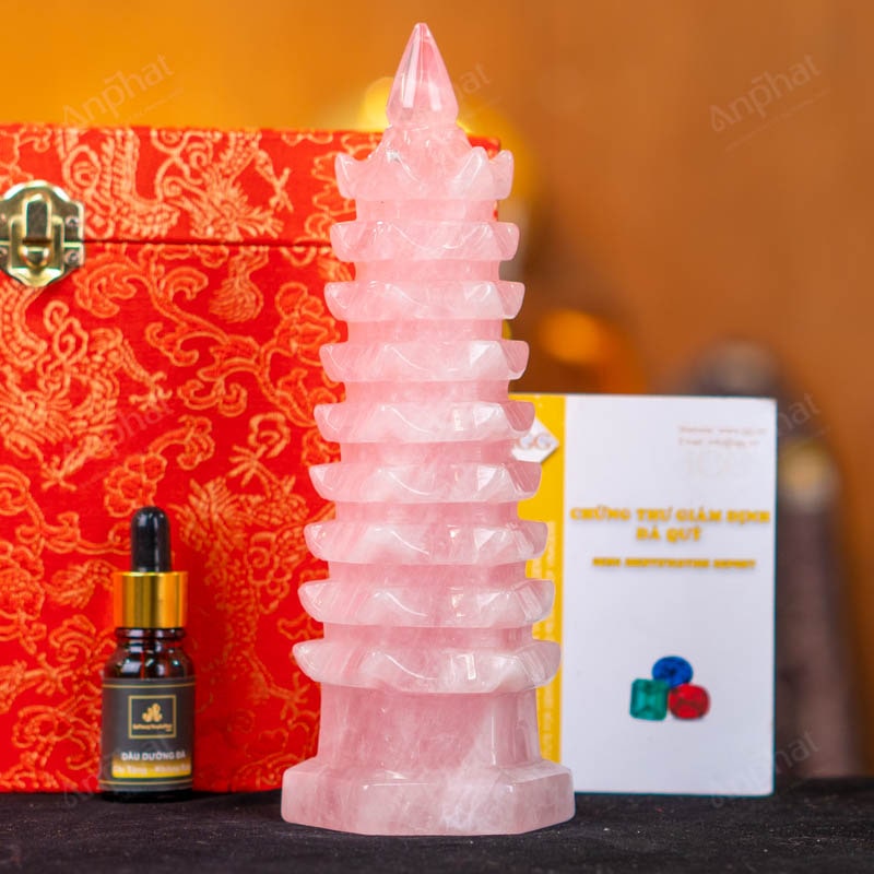 - Trọn bộ sản phẩm bao gồm: Tháp văn xương + hộp đựng sang trọng + túi giấy sang trọng + dầu dưỡng đá + thiệp + giấy kiểm định chất lượng đá