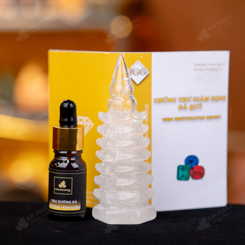 - Trọn bộ sản phẩm bao gồm: Tháp văn xương + hộp đựng sang trọng + túi giấy sang trọng + dầu dưỡng đá + thiệp + giấy kiểm định chất lượng đá