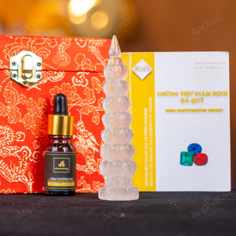 - Trọn bộ sản phẩm bao gồm: Tháp văn xương + hộp đựng sang trọng + túi giấy sang trọng + dầu dưỡng đá + thiệp + giấy kiểm định chất lượng đá