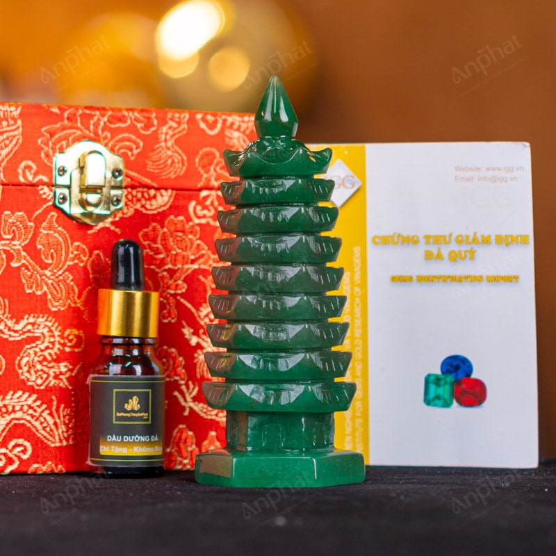 - Trọn bộ sản phẩm bao gồm: Tháp văn xương + hộp đựng sang trọng + túi giấy sang trọng + dầu dưỡng đá + thiệp + giấy kiểm định chất lượng đá