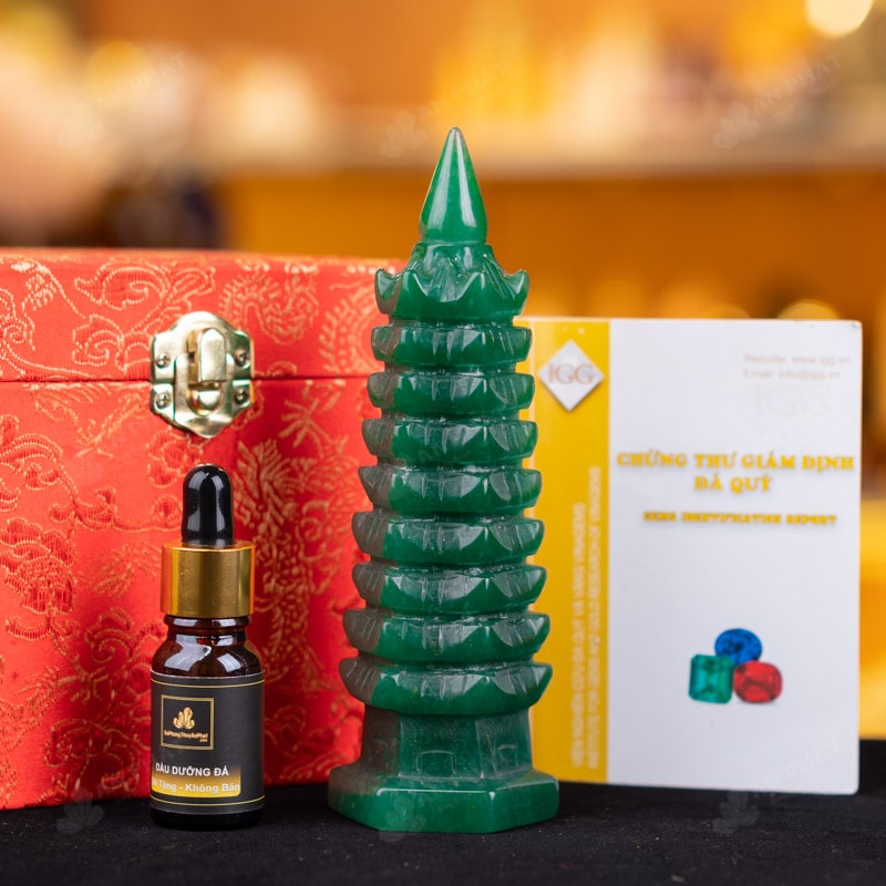 - Trọn bộ sản phẩm bao gồm: Tháp văn xương + hộp đựng sang trọng + túi giấy sang trọng + dầu dưỡng đá + thiệp + giấy kiểm định chất lượng đá