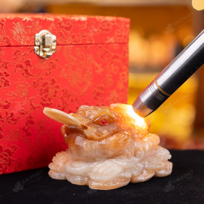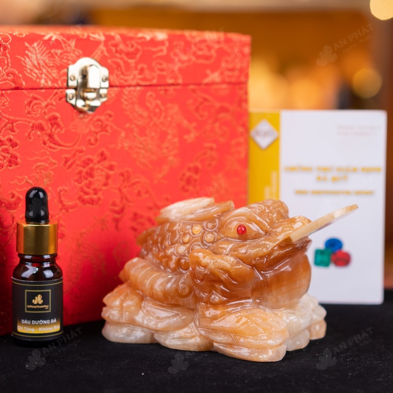 - Trọn bộ sản phẩm bao gồm: thiềm thừ + hộp đựng sang trọng + túi giấy sang trọng + dầu dưỡng đá + thiệp + giấy kiểm định chất lượng đá + khăm thơm bao sái + giấy hưỡng dẫn trực tiếp an vị + khai quang tại chùa Tứ Kỳ