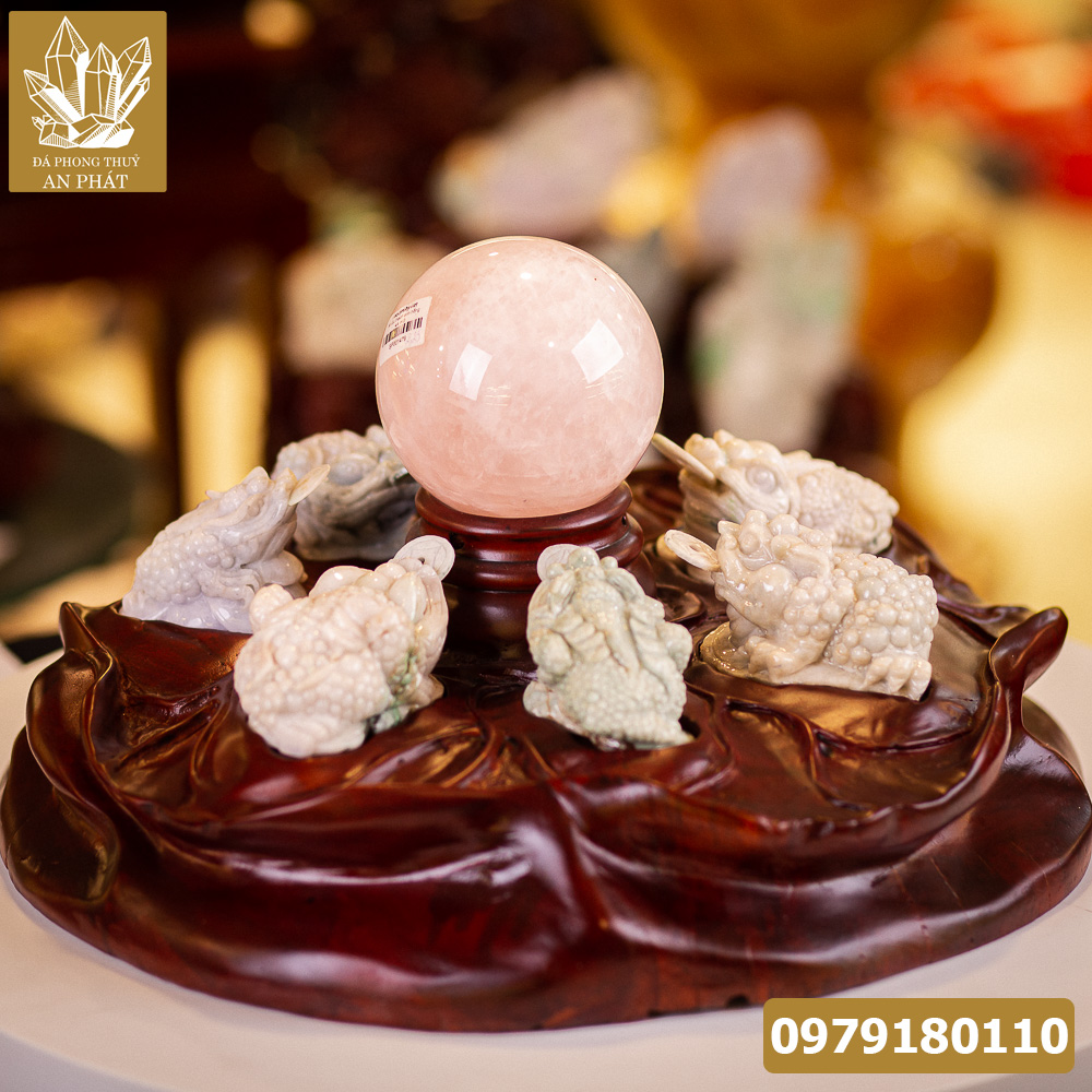 Đây là sự kết hợp độc đáo đến từ 7 cụ thiềm thừ và một viên đá thạch anh hồng đặt ngay giữa. Mỗi cụ sẽ mang đến một sắc thái khác nhau khiến giá trị phong thuỷ càng được nổi bật. Ngoài ra, chất liệu của thiềm thừ được chế tác từ 100% đá Jadeit tự nhiên. Kết tinh cùng với viên châu làm bằng thạch anh hồng mang lại sức mạnh không ai có được. Do đó, bạn hoàn toàn có thể cảm nhận được độ linh ứng đến từ siêu phẩm này.