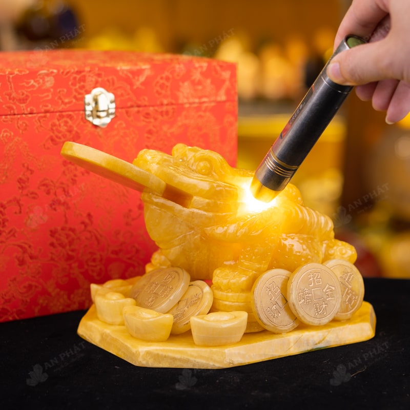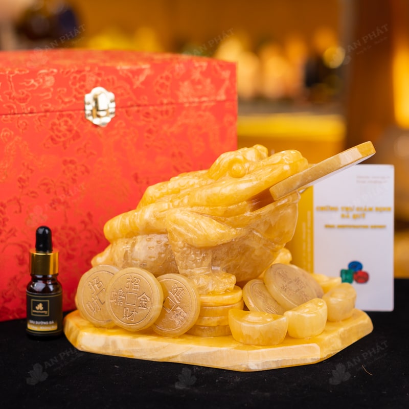 - Trọn bộ sản phẩm bao gồm: thiềm thừ + hộp đựng sang trọng + túi giấy sang trọng + dầu dưỡng đá + thiệp + giấy kiểm định chất lượng đá + khăm thơm bao sái + giấy hưỡng dẫn trực tiếp an vị + khai quang tại chùa Tứ Kỳ