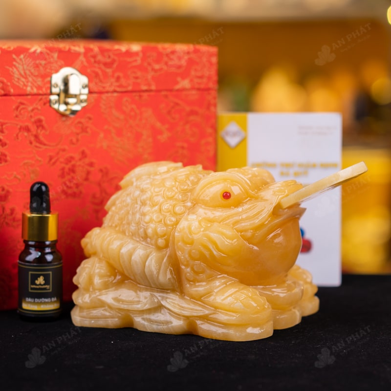 - Trọn bộ sản phẩm bao gồm: thiềm thừ + hộp đựng sang trọng + túi giấy sang trọng + dầu dưỡng đá + thiệp + giấy kiểm định chất lượng đá + khăm thơm bao sái + giấy hưỡng dẫn trực tiếp an vị + khai quang tại chùa Tứ Kỳ