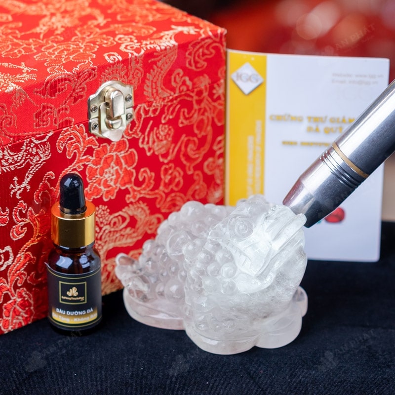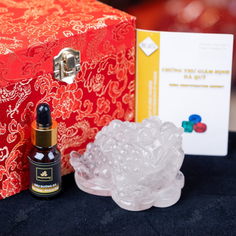 - Trọn bộ sản phẩm bao gồm: thiềm thừ + hộp đựng sang trọng + túi giấy sang trọng + dầu dưỡng đá + thiệp + giấy kiểm định chất lượng đá + khăn thơm bao sái + giấy hướng dẫn trực tiếp an vị + khai quang tại chùa Tứ Kỳ