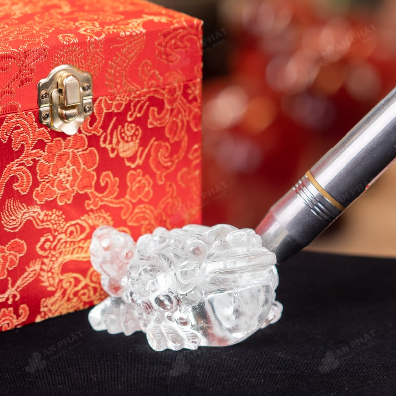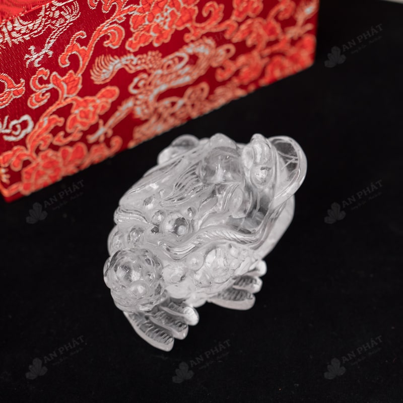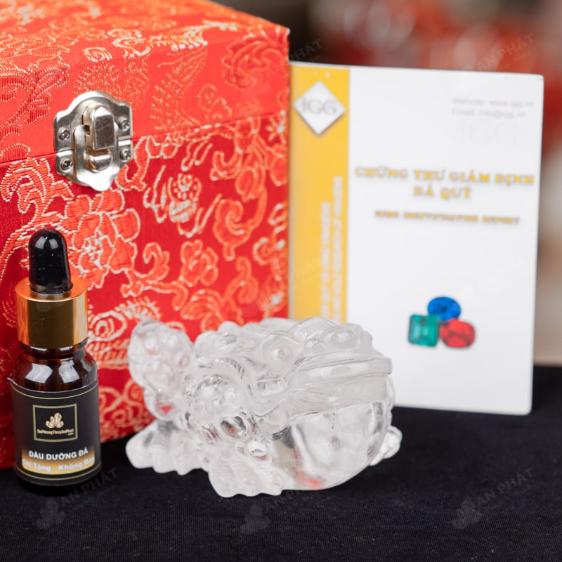 - Trọn bộ sản phẩm bao gồm: thiềm thừ + hộp đựng sang trọng + túi giấy sang trọng + dầu dưỡng đá + thiệp + giấy kiểm định chất lượng đá + khăn thơm bao sái + giấy hướng dẫn trực tiếp an vị + khai quang tại chùa Tứ Kỳ