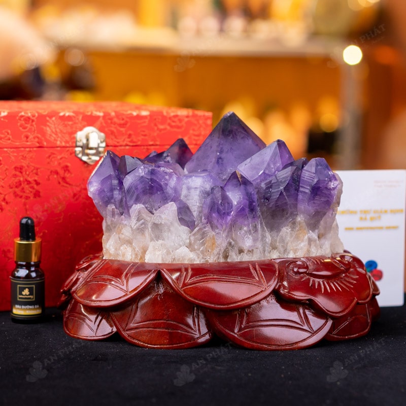 - Trọn bộ sản phẩm bao gồm: tinh thể thạch anh + đế gỗ + dầu dưỡng đá + thiệp + giấy kiểm định chất lượng đá