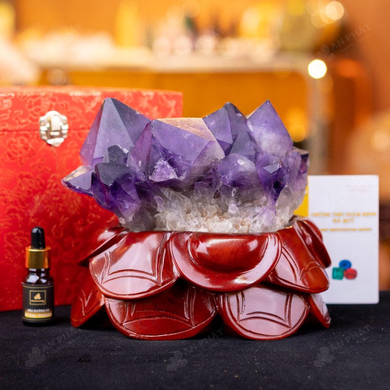- Trọn bộ sản phẩm bao gồm: tinh thể thạch anh + đế gỗ + dầu dưỡng đá + thiệp + giấy kiểm định chất lượng đá