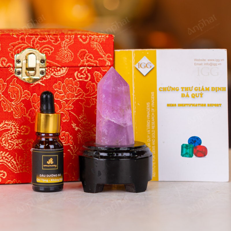 - Trọn bộ sản phẩm bao gồm: trụ đá + đế gỗ + hộp đựng sang trọng + túi giấy sang trọng + dầu dưỡng đá + thiệp + giấy kiểm định chất lượng đá
