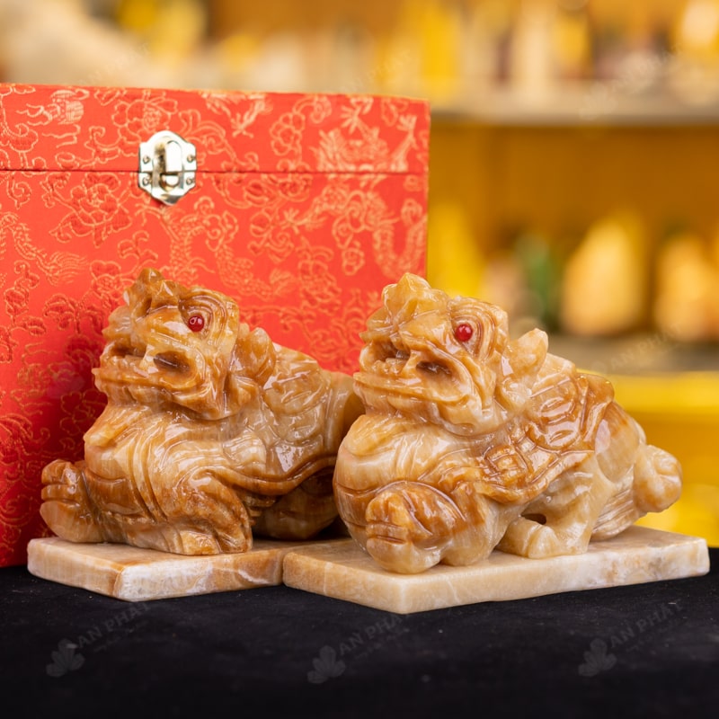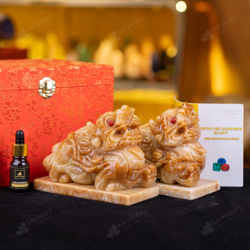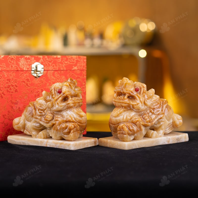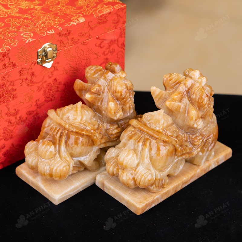 Ảnh cận cảnh cặp Tỳ Hưu đá canxit vàng