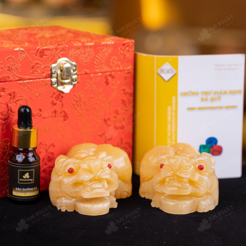 - Trọn bộ sản phẩm bao gồm: tỳ hưu + hộp đựng sang trọng + túi giấy sang trọng + dầu dưỡng đá + thiệp + giấy kiểm định chất lượng đá + khăm thơm bao sái + giấy hưỡng dẫn trực tiếp an vị + khai quang tại chùa Tứ Kỳ